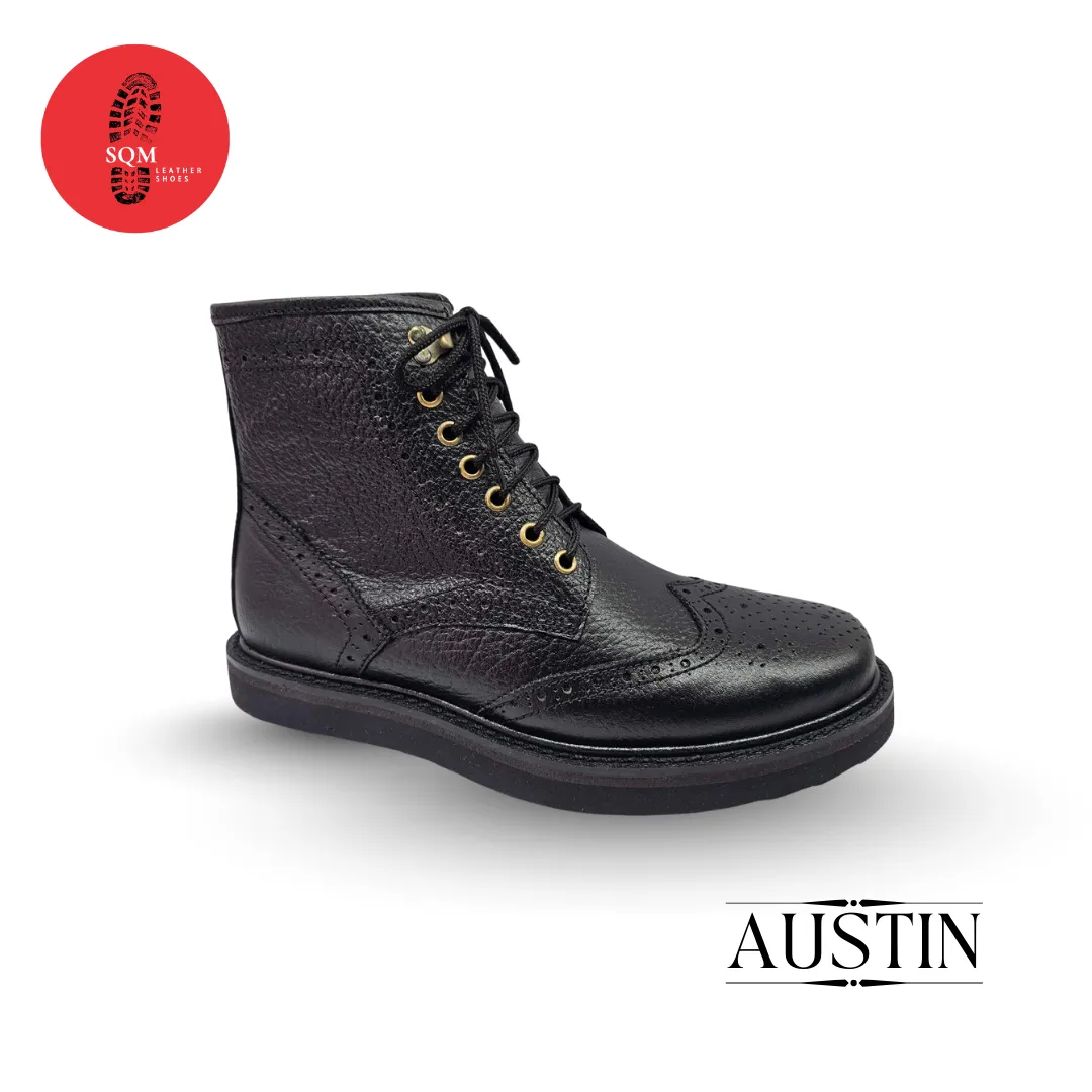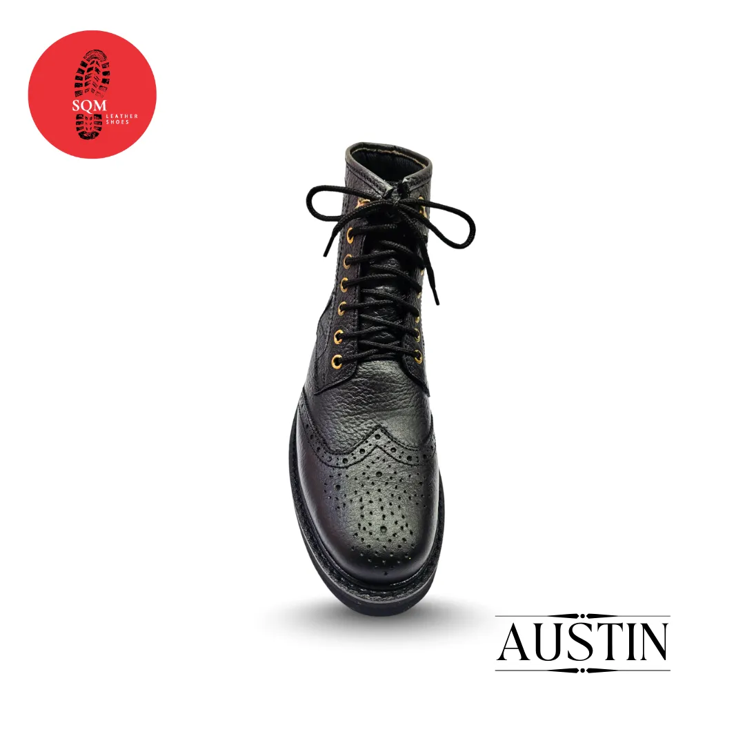 Command attention with these stylish black leather boots. Designed with brogue detailing and a sturdy lace-up build, they offer durability & comfort. Perfect for everyday wear or motorcycle use.